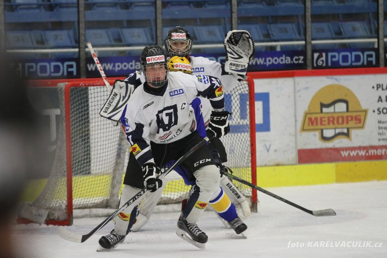 Druhá třetina se rozjížděla zpozvolna, až ve 25. minutě musel Dufek řešit gólovou šanci Valíčka, kterou svým rychlým přesunutím vyřešil bravurně. O tři minuty později se do šance dostal i domácí Peterka, který ujel po pravém křídle a střelou švihem orazítkoval pravou tyč Vaculovy branky.