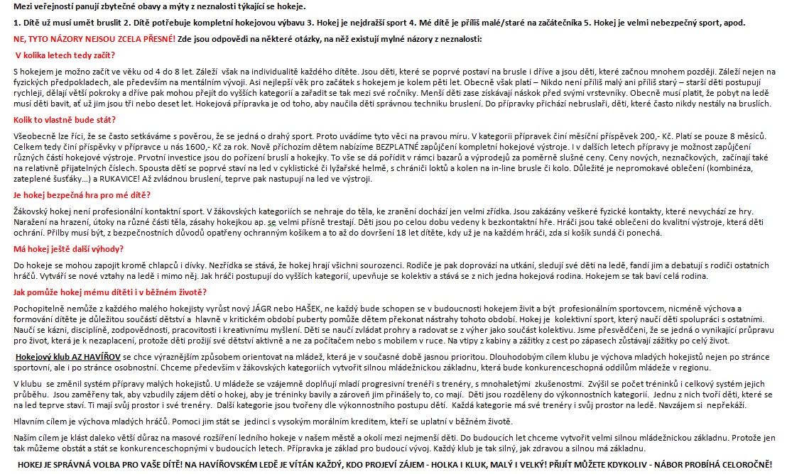 Pokud rodiče váhají, kladou si otázku, proč dát své dítě na hokej, nebo slyšeli různé odrazující informace, mohou si ZDE přečíst odpovědi na NEJČASTĚJI KLADENÉ OTÁZKY, jako např. v kolika letech začít, zda je hokej bezpečná hra pro mé dítě, či kolik to vlastně bude stát.