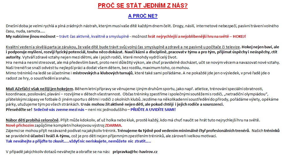 Rovněž, pokud chtějí rodiče vědět, co je náplní výchovy malých hokejistů v AZetu, mohou si ZDE přečíst PROČ SE STÁT JEDNÍM Z NÁS?