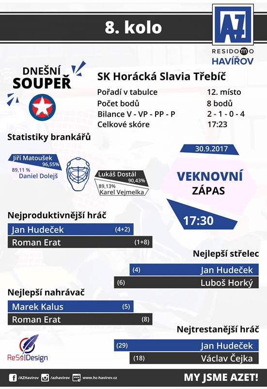 „Třebíč teď vyhrála venku se Slavií a pomalu se rozjíždí. Nás tak čeká těžký zápas, tak jako v Třebíči vždy," okomentoval stručně následující sobotní bitvu s Horáckou Slavií trenér Martin Janeček. V případě tříbodové výhry by se AZ mohl v tabulce odlepit z osmého místa a teoreticky atakovat i třetí příčku. Uvidíme, jak se situace po sobotě vyvine. Loni patřila Třebíč mezi jedny z mála oblíbených soupeřů Havířova. Hráči AZetu vyhráli tři ze čtyř vzájemných utkání a podobnou sérii by rádi zopakovali i letos. S pomocí uspět přispěchá i útočník Jakub Matai, který přichází do Havířova na měsíc s možnou opcí. Vedení Azetu tímto reaguje na poslední zranění svých útočníků. Jakub Matai v posledních sezónách působil v Olomouci a bojoval o smlouvu v Litvínově. Kromě centra může nastoupit i na křídle, čímž trenérům poskytuje určitou flexibilitu při skládání lajn.