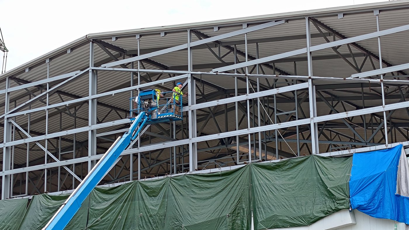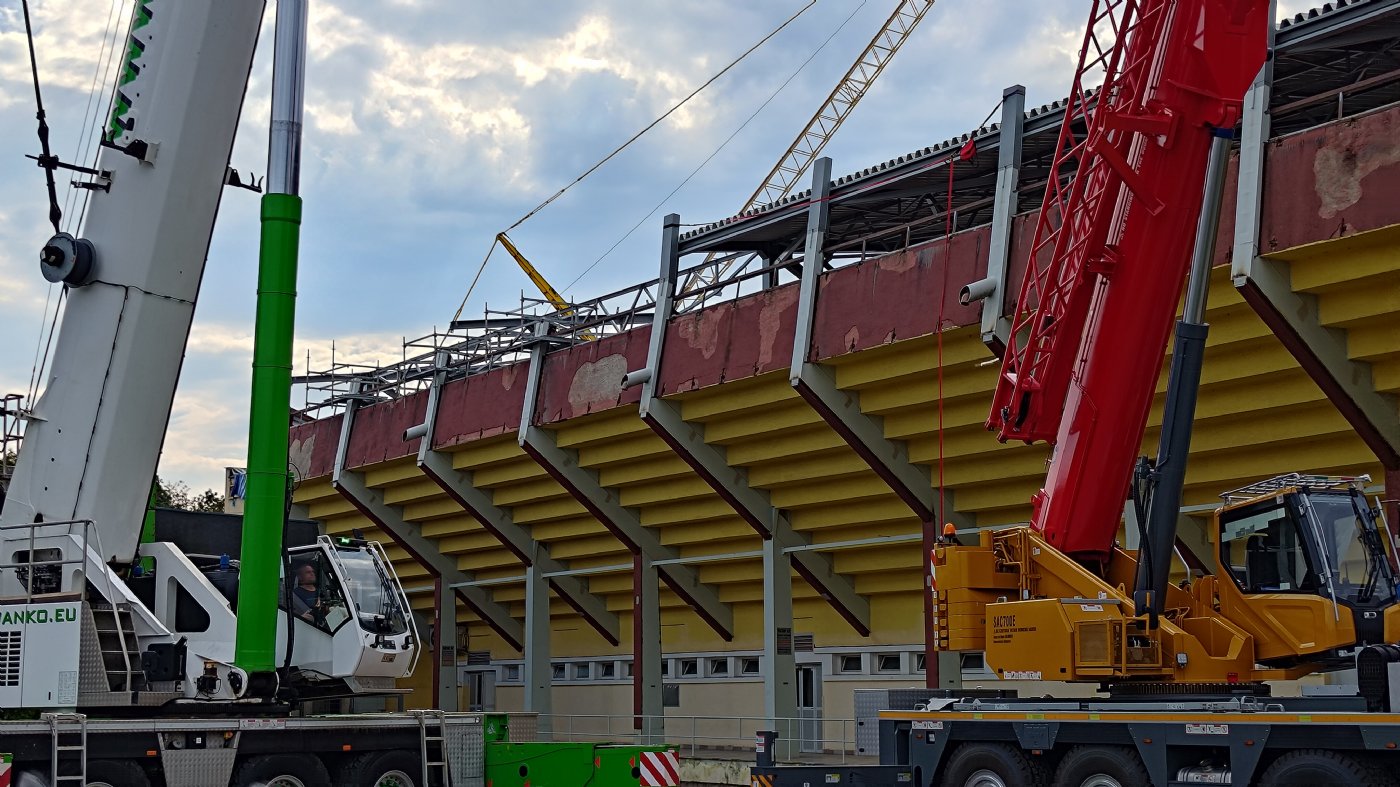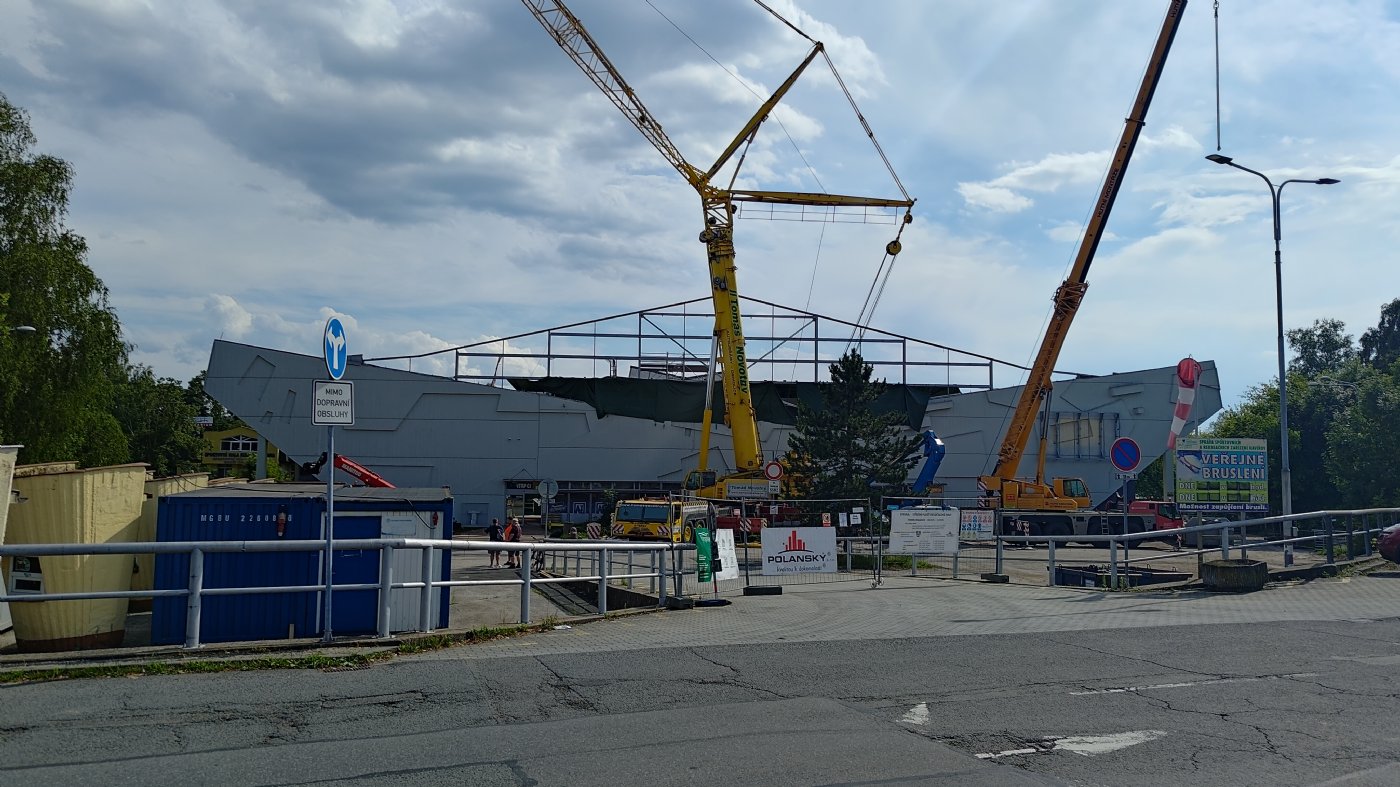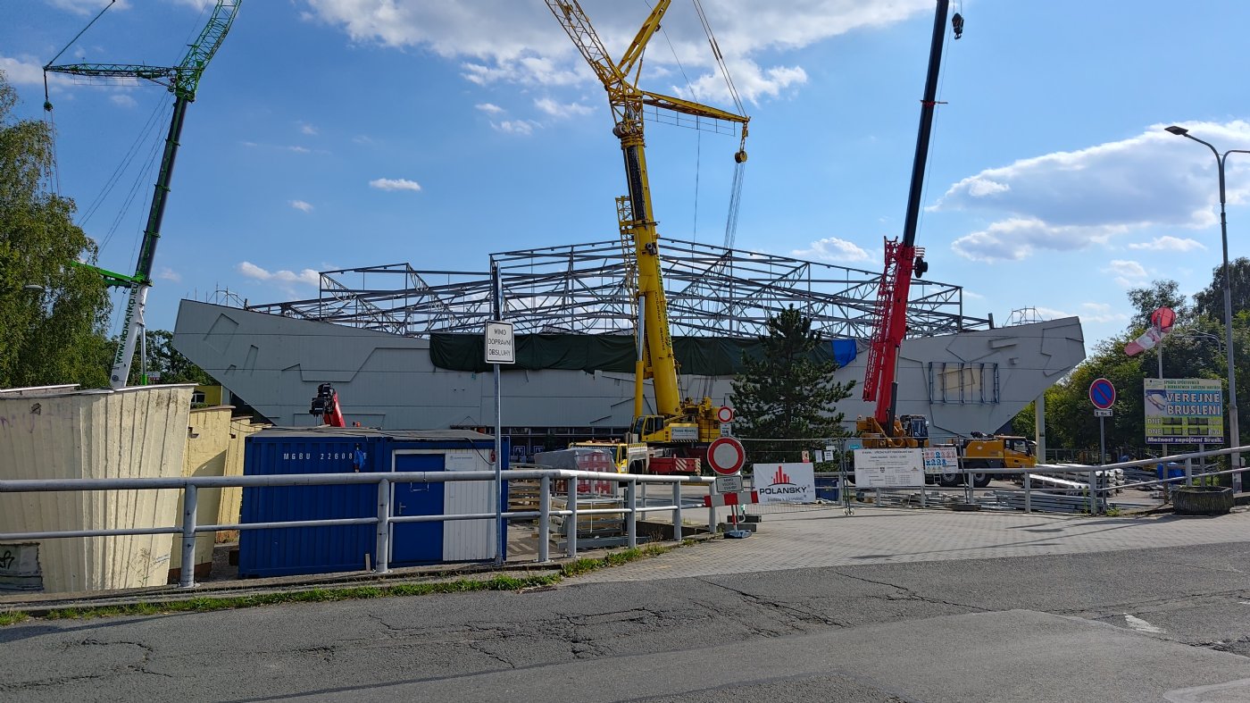 Bohuslav Niemiec: "Nejtěžší bylo za námi ve chvíli, jakmile se sundala střecha a položily se nad ní vaznice. Určitě jste si všiml, že v minulých dnech se velké jeřáby přesunuly na ulici Hálkova, před několika dny šly nahoru vaznice 1 a 2, v tu dobu jsme měli vaznice na celé střeše, následně nastoupili pokrývači, čili tvoří se střešní plášť a trapézy, mezitím se provizorně zakryla celá část nad administrativní budovou, ať tam pokud možno nezateče, no a poté je třeba co nejrychleji udělat práci nad zmíněnou administrativní částí. V tu chvíli můžeme říct "jo, to nejtěžší je za námi". Následně se bude řešit střešní plášť, akustika, elektrika, nicméně tohle už nejsou věci, které by nás měly nějak brzdit."