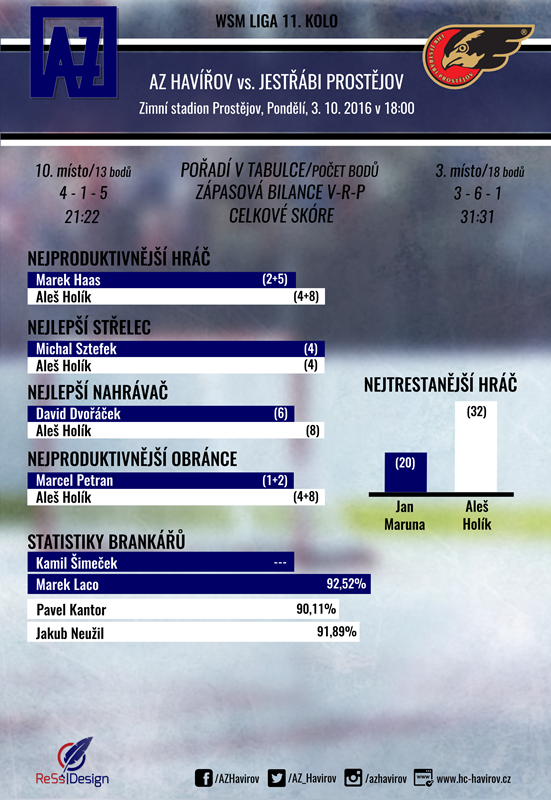 AZ odjel na prostějovský led již v přípravě. Utkání však zůstalo ve třetí třetině za stavu 2:2 nedohráno. Havířovští hráči si z tohoto duelu odvezli několik zranění, přičemž Marek Kalus se z tohoto zápasu stále dává dohromady. „Nově na marodku přibyli Hlinka, Nevadba a Dvořáček. Při pohledu na tabulku je zřejmé, že potřebujeme bodovat. Motivací je mj. také vzpomínka na srpnové přátelské utkání,“ říká před zápasem manažer klubu Patrik Rimmel.