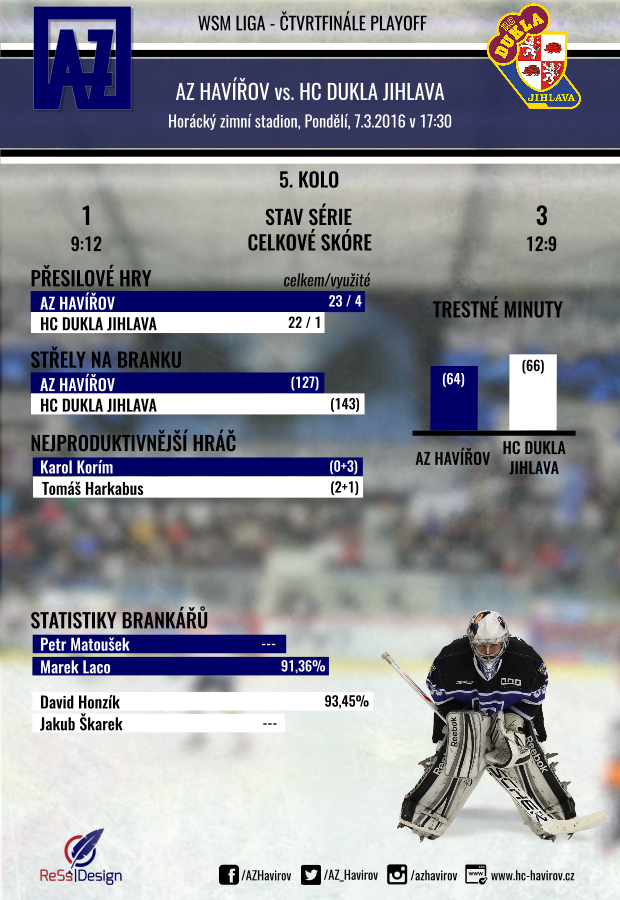 Před víkendem se série Havířova s Jihlavou přesunula do Slezska za stavu 2:0 pro Duklu. Na havířovském ledě byly k vidění dva parádní souboje s rozdílnými výsledky. Zatímco v pátek AZ dominoval v první polovině utkání, vytvořil si náskok 4:0 a i přes "návrat" jihlavských do zápasu, dovedl utkání do vítězného konce 5:2. V sobotu lépe nastoupila Dukla, vedla 2:0 a i když se havířovští vzchopili a srovnali, branka Skořepy v 54. minutě rozhodla o výhře hostí 3:2.