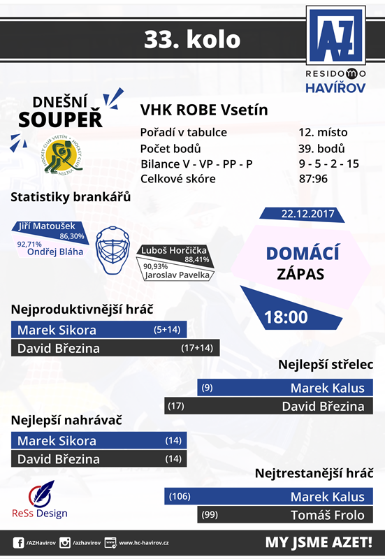 Havířovští hokejisté, v poslední době podávají střídavé výkony. V předminulém kole, však na domácím ledě dokázali urvat tři body, když na Havířovský led GASCONTROL Arény zavítali hokejisté Kadaně. Zápas byl hodně vyrovnaný, ale ve třetí třetině, dokázali domácí borci strhnout na svou stranu jak výhru, tak plné tři body. Hosté ale ještě v závěru utkání zdramatizovali, když v power-play, tudíž hry bez brankáře dokázali snížit náskok AZetu jen na jednu branku. Havířov si však pak již výsledek pohlídal.