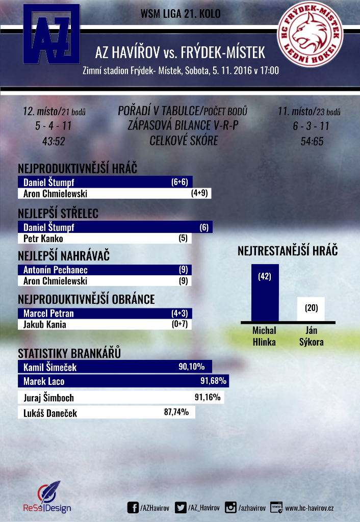 Pro úplnost připomeňme, že předchozí vzájemný zápas na havířovském ledě vyhráli v září hosté 2:1 (reportáž z utkání ZDE). Druhé derby sezony mezi Frýdkem-Místkem a AZ Havířov začíná v hale Polárka v sobotu 5. 11. 2016 v 17:00. Pro ty, kteří se nedostanou přímo do hlediště haly, bude připraven tradiční textový on-line přenos.