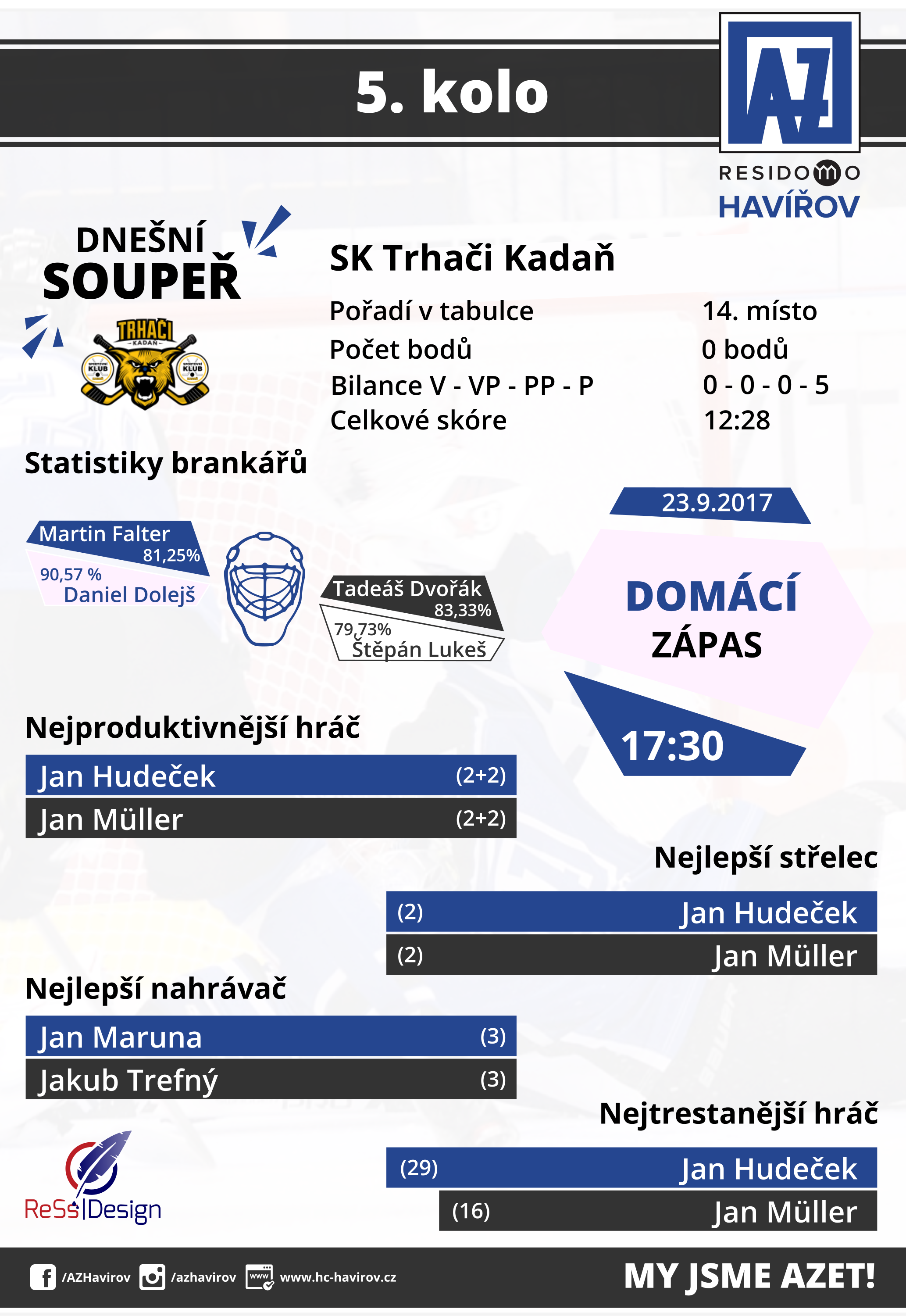 AZ se po čtyřech zápasech nenachází v pozici, kterou mu před startem soutěže mnozí přisuzovali. K lepším výkonům se svěřenci trenéra Martina Janečka budou chtít odrazit v sobotním domácím zápase s Kadaní. Lepšího soupeře AZ aktuálně dostat nemohl. Trhači totiž trhají pouze ve svém názvu a po pěti kolech mají na svém kontě stále nula bodů. Pro Havířov to znamená jediné - zisk tří bodů a započetí vítězné série. Zda-li se mu to podaří, uvidíme přímo na místě v Gascontrol Aréně v sobotu 23.9. od 17:30!