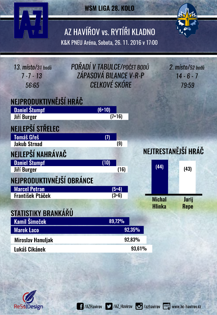 Napravit dojem mohou AZeťáci proti atraktivnímu soupeři. Kladno je samozřejmě jedním ze spolufavoritů WSM ligy, ale havířovští hokejisté na něj letos umějí. Potvrdili to jak doma, když vyhráli ve 2. kole 2:1, tak i venku, protože v 15. kole vyhráli na Kladně 4:3p.