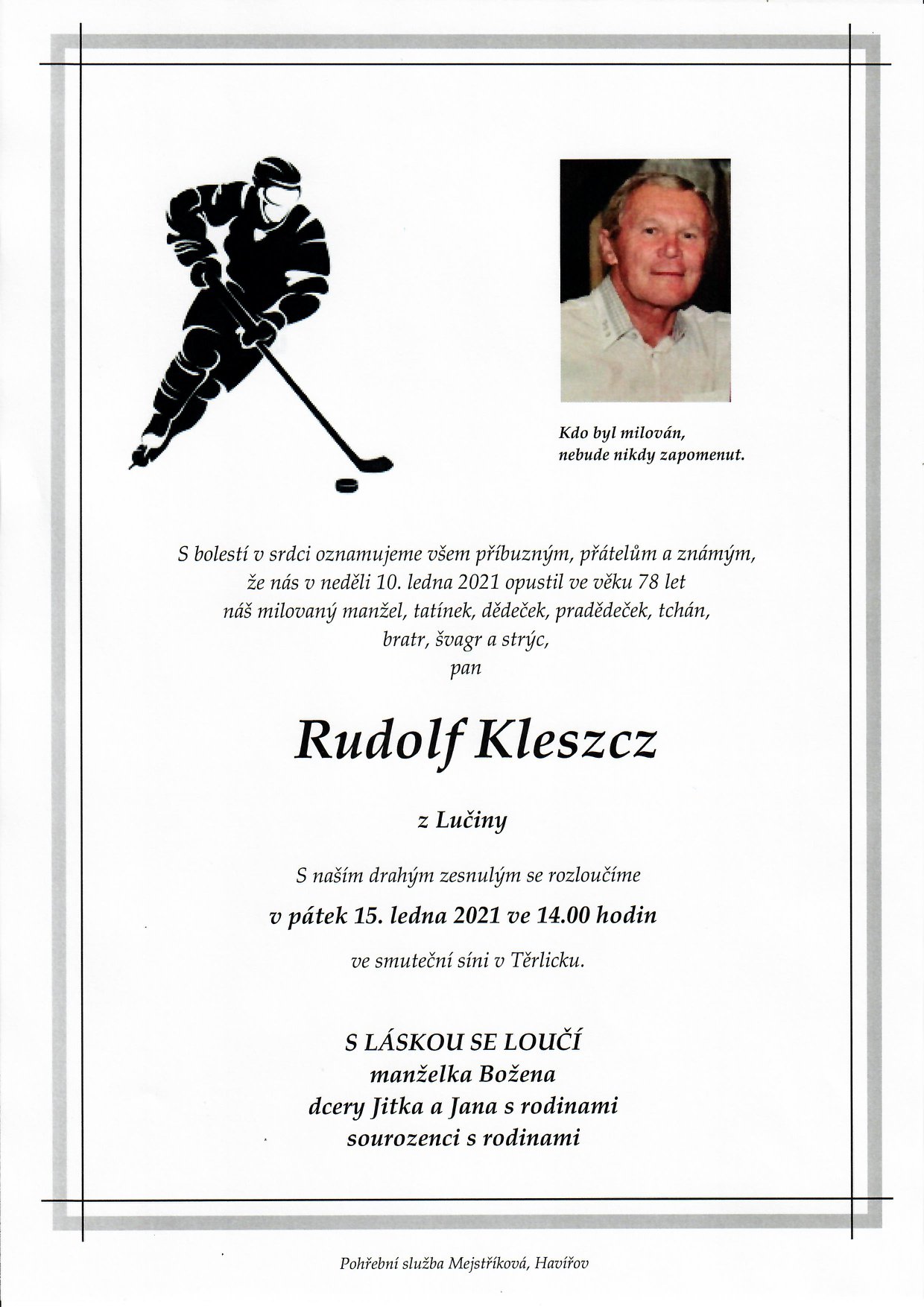 Ve věku 78 let nás v neděli 10.1. 2021 opustil někdejší kapitán i trenér Havířova, člen síně slávy AZetu - Rudolf Kleszcz. Rodině, přátelům a nejbližším vyjadřujeme za celý klub upřímnou soustrast.