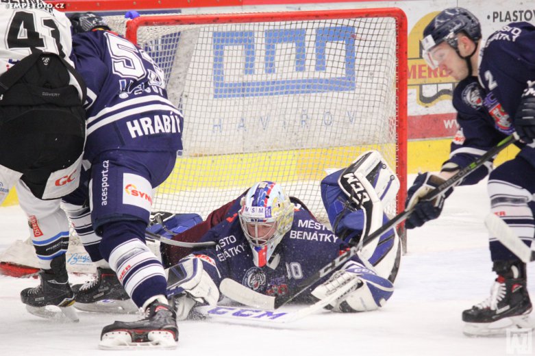 To se povedlo Benáteckým na začátku 12. minuty, když Dominik Hrníčko vyslal střelu od modré čáry, která zapadla přesně do pravého horního rohu Bláhovy branky. O pět minut později měl velkou šanci vyrovnat Kalus, ale nedokázal přehodit ležícího Kořenáře. Po první třetině tedy vedly Benátky 0:1.