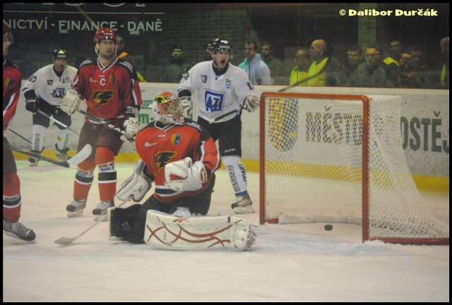 Jestřábi se nakonec dokázali prosadit tři minuty před koncem, kdy využili přesilovou hru. Smejkal vyslal jedovatou střelu, kterou brankář hostů jen vyrazil a Jan Kolibár s vypětím všech sil dotlačil odražený puk za brankovou čáru.